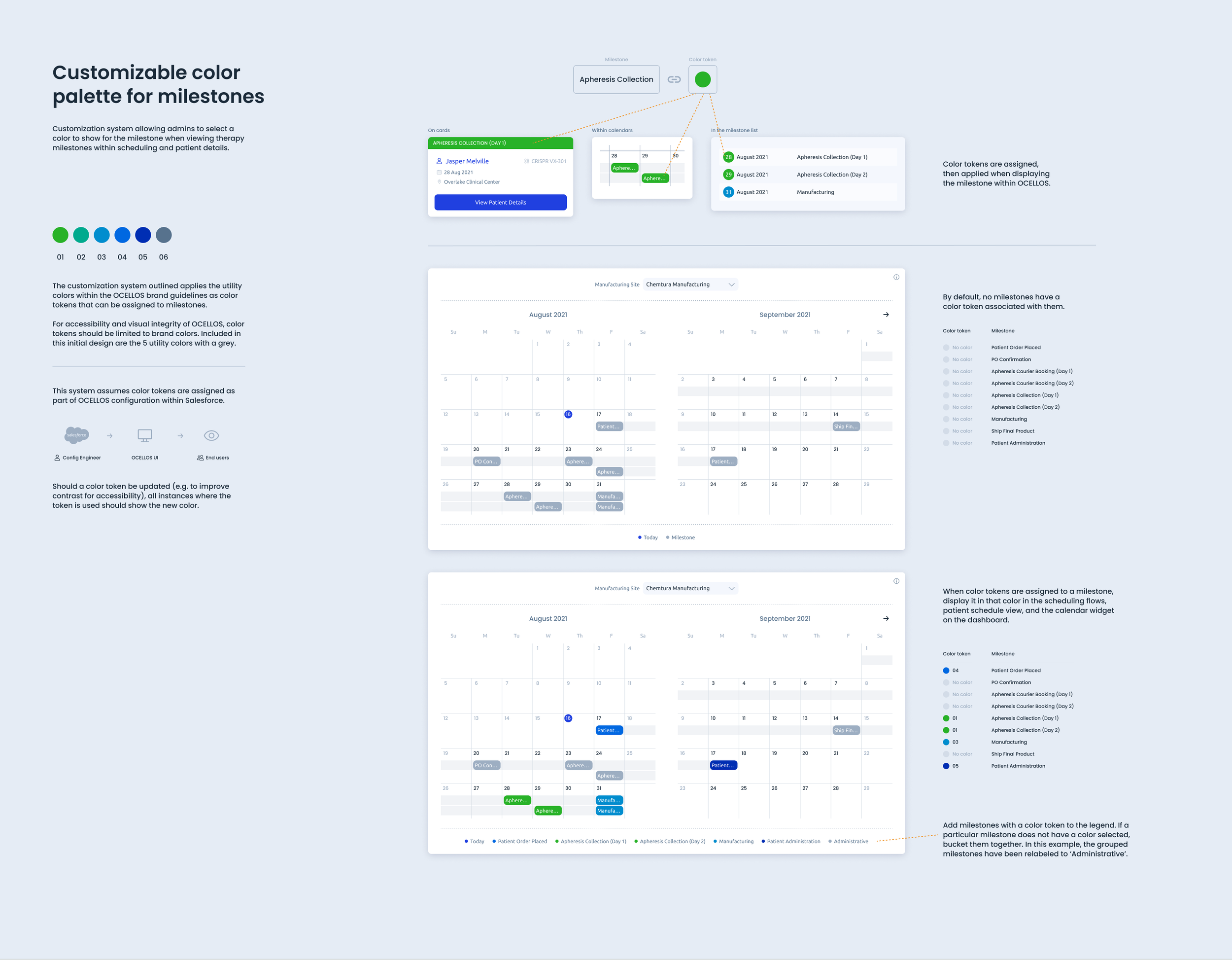 I designed a color token system allowing customers to customize their views of patient and timeline data across the product, reinforcing critical patient milestones. This feature connects across multiple touchpoints for the end user and is designed for flexibility across different user personas.